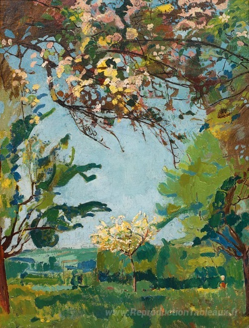 Nous vous proposons une reproduction artisanale sur toile du célèbre tableau 'Blütenzeit' de Cuno Amiet, provenant du Musée de la Reproduction.
