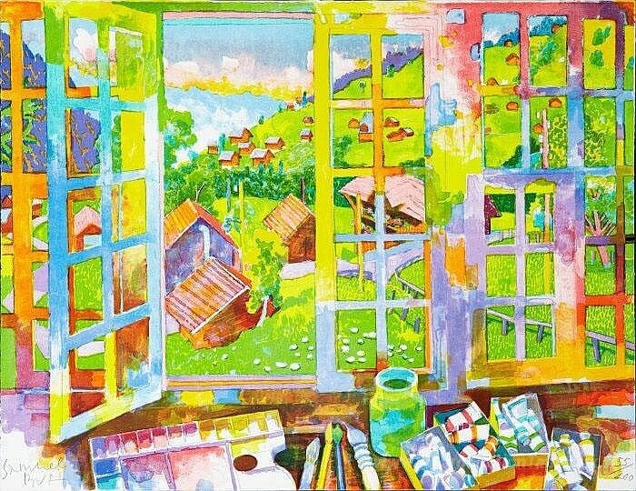 Nous vous proposons une reproduction artisanale sur toile du célèbre tableau 'Blick aus dem Atelierfenster' de Samuel Buri, provenant du Musée de la Reproduction.