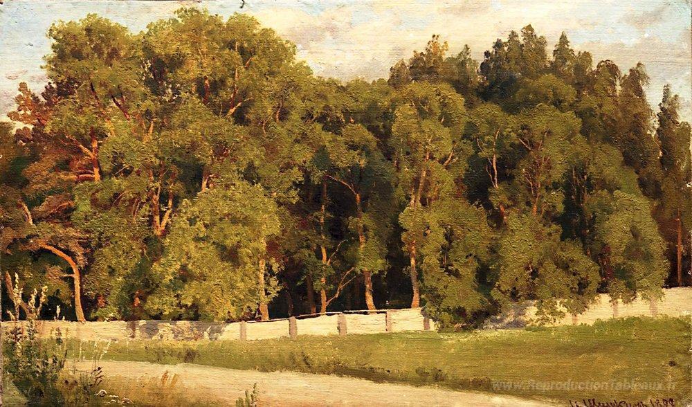 Nous vous proposons une reproduction artisanale sur toile du célèbre tableau 'Bois derrière la clôture' de Ivan Shishkin, provenant du Musée de la Reproduction.