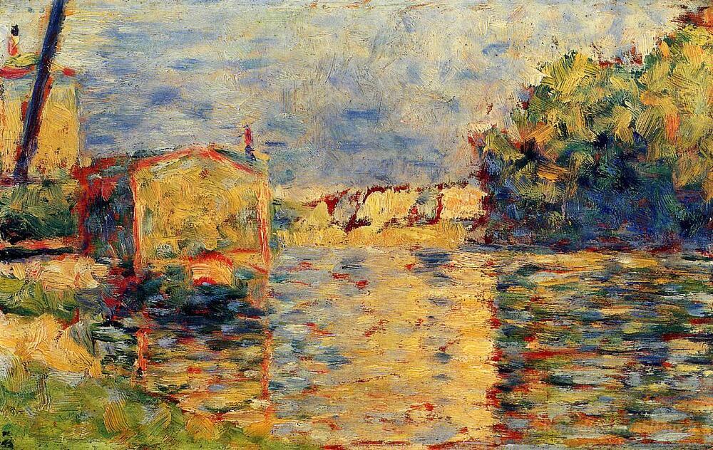 Nous vous proposons une reproduction artisanale sur toile du célèbre tableau 'Bord de la rivière' de Georges Seurat, provenant du Musée de la Reproduction.