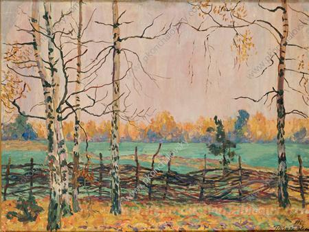 Nous vous proposons une reproduction artisanale sur toile du célèbre tableau 'Bouleau par la clôture' de Pyotr Konchalovsky, provenant du Musée de la Reproduction.