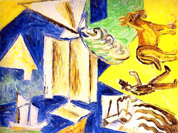 Nous vous proposons une reproduction artisanale sur toile du célèbre tableau 'Bridge (répétition de la composition de 1911)' de David Burliuk, provenant du Musée de la Reproduction.