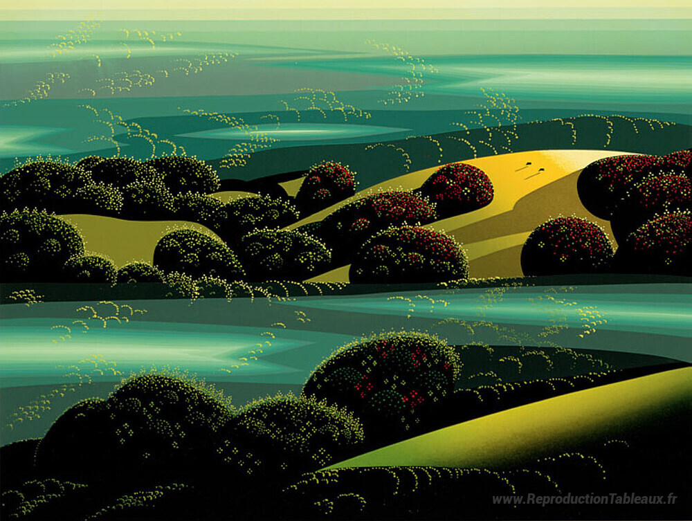 Nous vous proposons une reproduction artisanale sur toile du célèbre tableau 'Brouillard émeraude' de Eyvind Earle, provenant du Musée de la Reproduction.