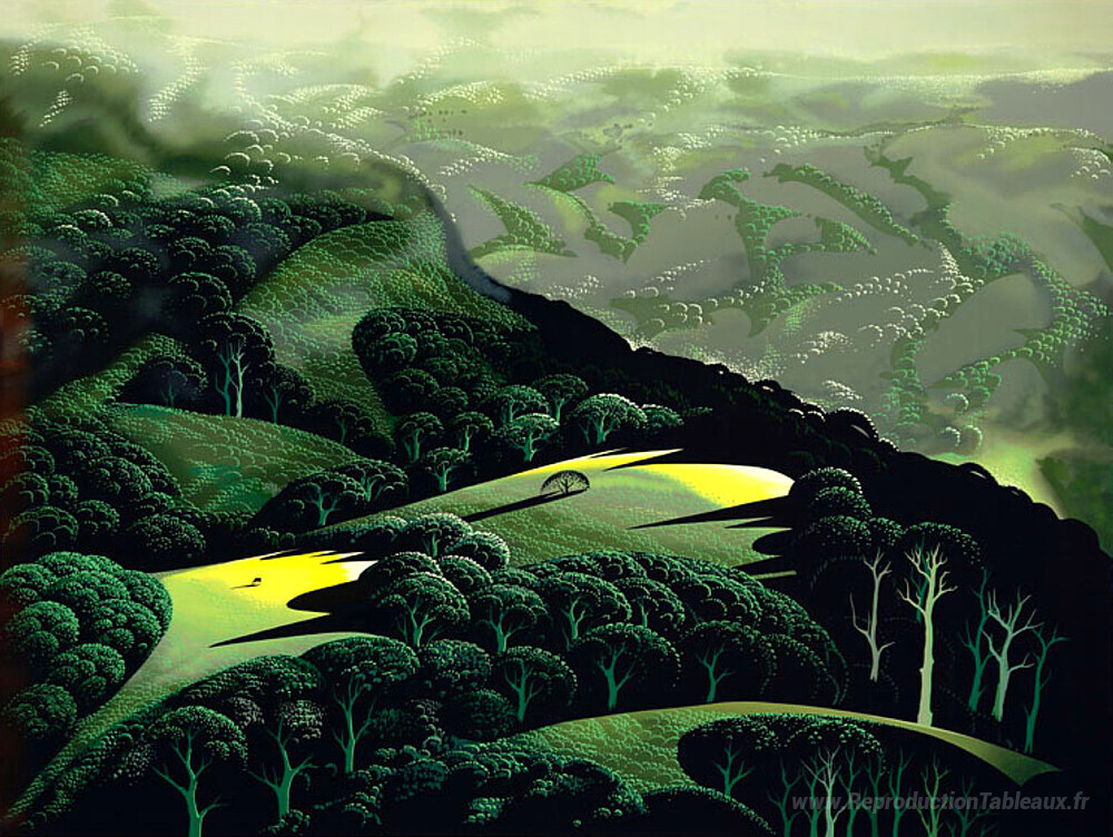 Nous vous proposons une reproduction artisanale sur toile du célèbre tableau 'Brouillard et tempête et pluie' de Eyvind Earle, provenant du Musée de la Reproduction.