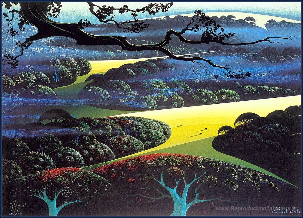 Nous vous proposons une reproduction artisanale sur toile du célèbre tableau 'Brouillard' de Eyvind Earle, provenant du Musée de la Reproduction.