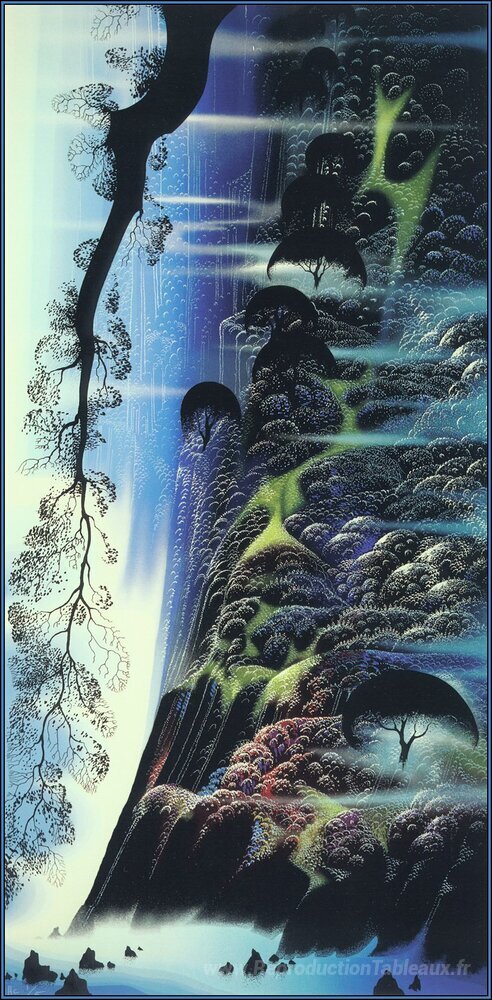 Nous vous proposons une reproduction artisanale sur toile du célèbre tableau 'Côte abrupte' de Eyvind Earle, provenant du Musée de la Reproduction.