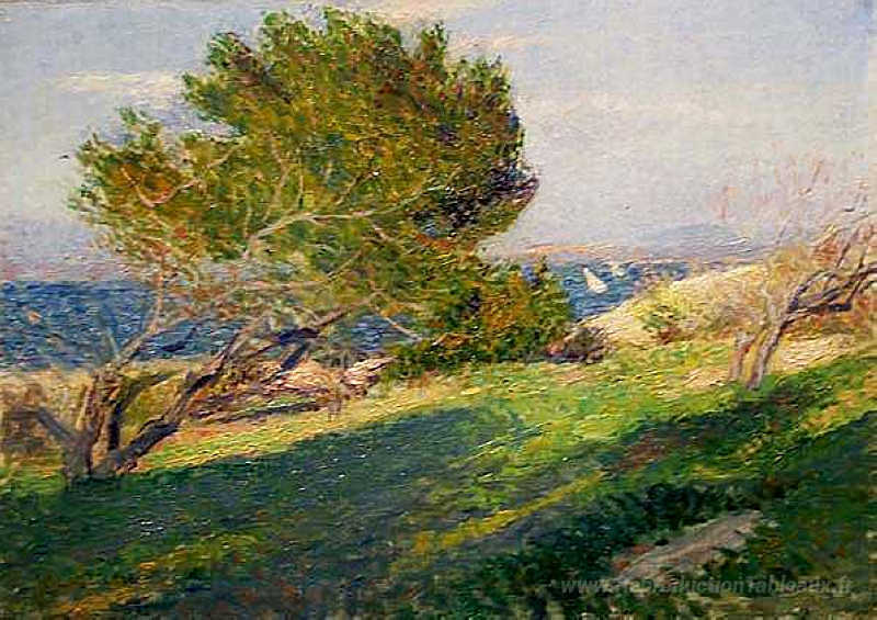 Nous vous proposons une reproduction artisanale sur toile du célèbre tableau 'Côte de Bretagne' de Willard Metcalf, provenant du Musée de la Reproduction.