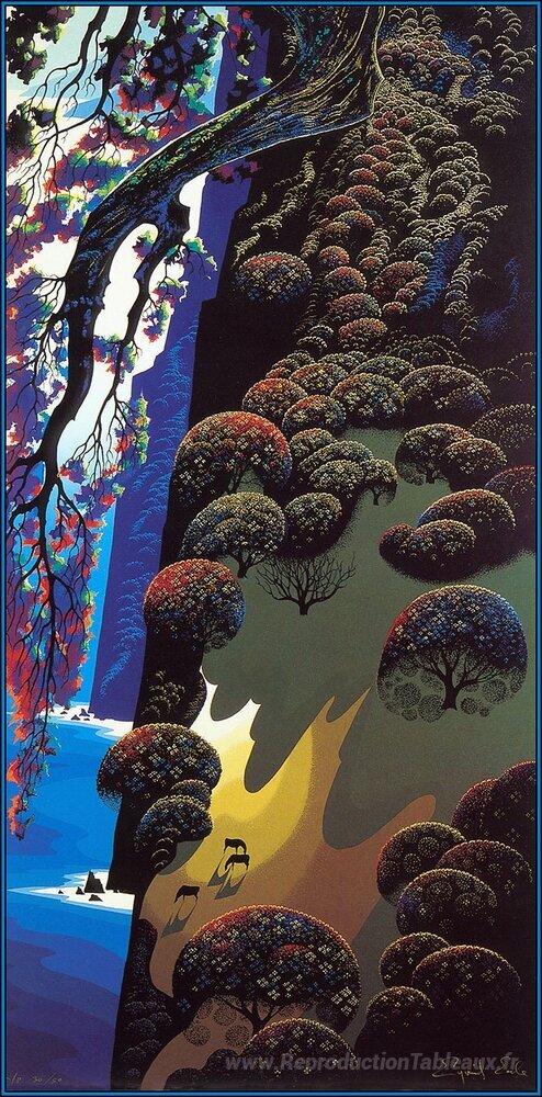 Nous vous proposons une reproduction artisanale sur toile du célèbre tableau 'Côte enchantée' de Eyvind Earle, provenant du Musée de la Reproduction.