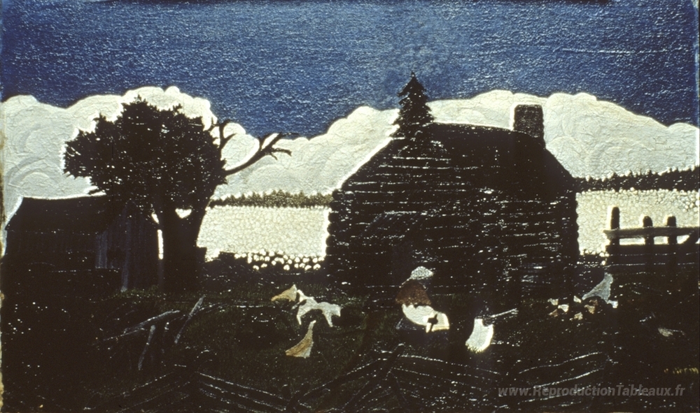 Nous vous proposons une reproduction artisanale sur toile du célèbre tableau 'Cabine dans le coton' de Horace Pippin, provenant du Musée de la Reproduction.