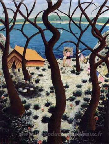 Nous vous proposons une reproduction artisanale sur toile du célèbre tableau 'Camping et projets' de Jules Lefranc, provenant du Musée de la Reproduction.