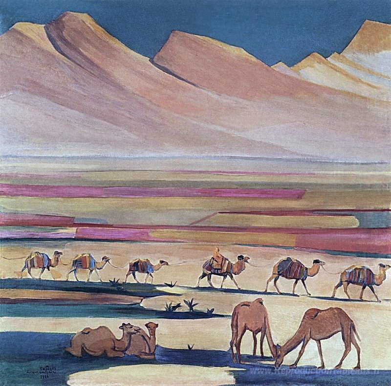 Nous vous proposons une reproduction artisanale sur toile du célèbre tableau 'Caravane' de Martiros Saryan, provenant du Musée de la Reproduction.