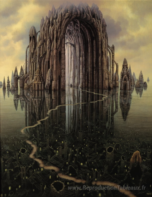 Nous vous proposons une reproduction artisanale sur toile du célèbre tableau 'cathédrale' de Jacek Yerka, provenant du Musée de la Reproduction.