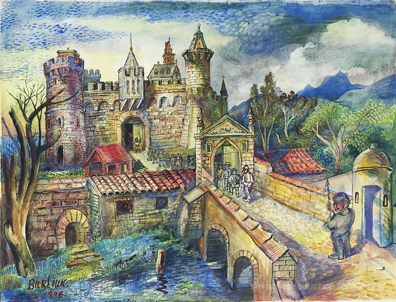 Nous vous proposons une reproduction artisanale sur toile du célèbre tableau 'Château anglais' de David Burliuk, provenant du Musée de la Reproduction.