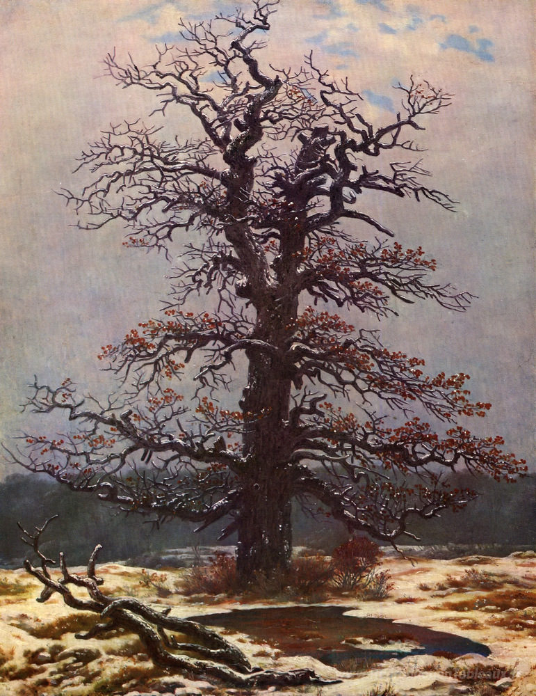 Nous vous proposons une reproduction artisanale sur toile du célèbre tableau 'Chêne dans la neige' de Caspar David Friedrich, provenant du Musée de la Reproduction.