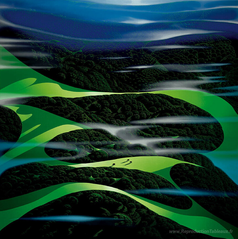 Nous vous proposons une reproduction artisanale sur toile du célèbre tableau 'Champs verts' de Eyvind Earle, provenant du Musée de la Reproduction.