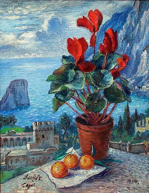 Nous vous proposons une reproduction artisanale sur toile du célèbre tableau 'Ciclamini' de David Burliuk, provenant du Musée de la Reproduction.