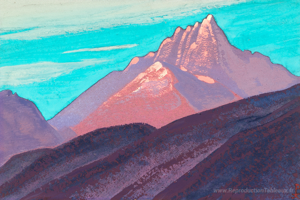 Nous vous proposons une reproduction artisanale sur toile du célèbre tableau 'Ciel turquoise, montagnes roses, pied violet' de Nicholas Roerich, provenant du Musée de la Reproduction.