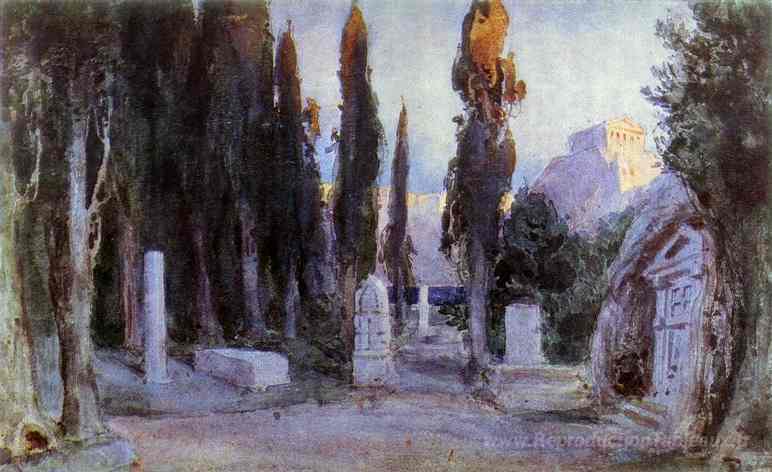 Nous vous proposons une reproduction artisanale sur toile du célèbre tableau 'Cimetière' de Vasily Polenov, provenant du Musée de la Reproduction.