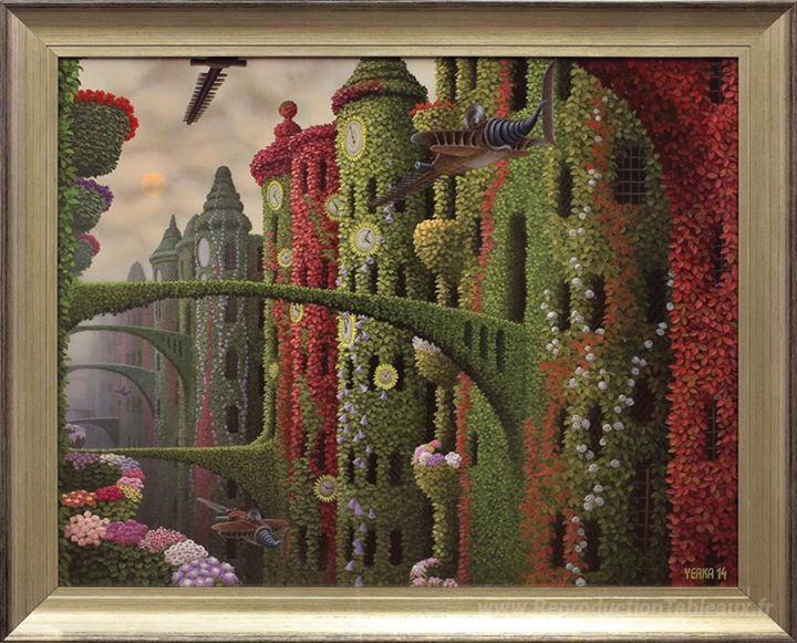 Nous vous proposons une reproduction artisanale sur toile du célèbre tableau 'Clôtures' de Jacek Yerka, provenant du Musée de la Reproduction.