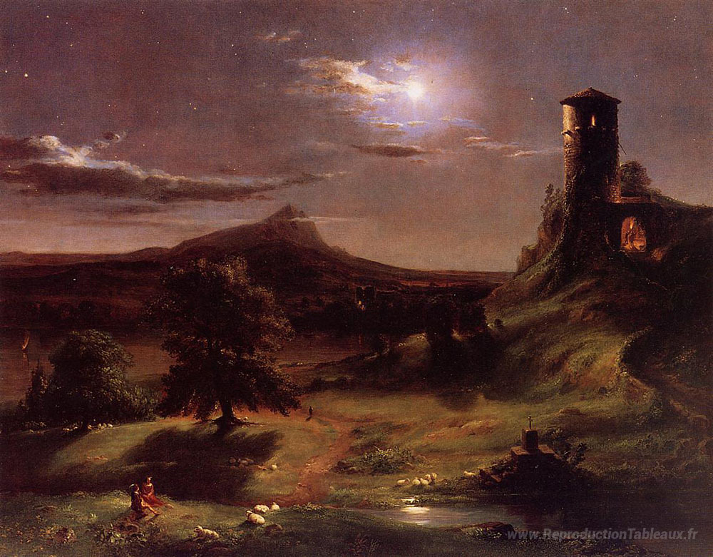 Nous vous proposons une reproduction artisanale sur toile du célèbre tableau 'Clair de lune' de Thomas Cole, provenant du Musée de la Reproduction.