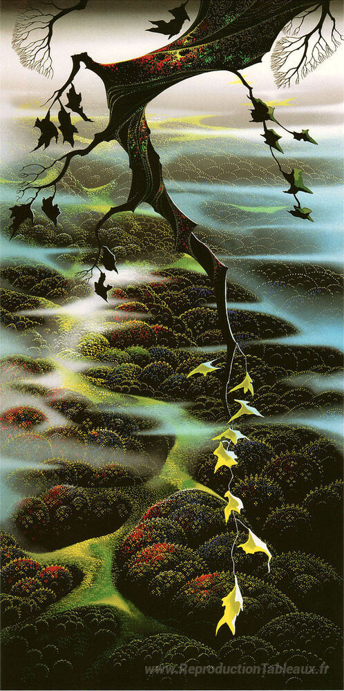Nous vous proposons une reproduction artisanale sur toile du célèbre tableau 'Collines à lacets de brouillard' de Eyvind Earle, provenant du Musée de la Reproduction.