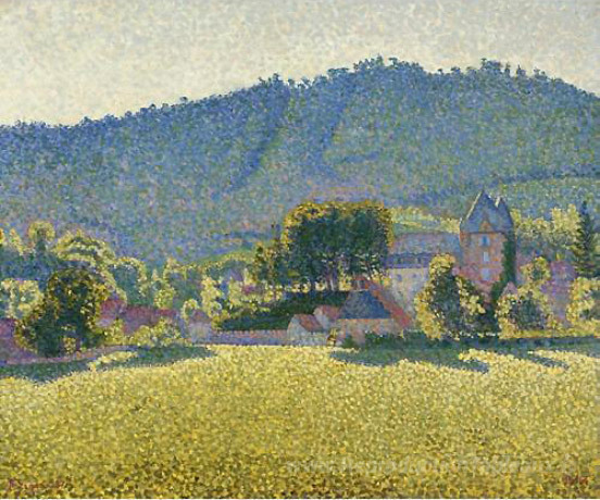 Nous vous proposons une reproduction artisanale sur toile du célèbre tableau 'Comblat et la vallée du cere' de Paul Signac, provenant du Musée de la Reproduction.
