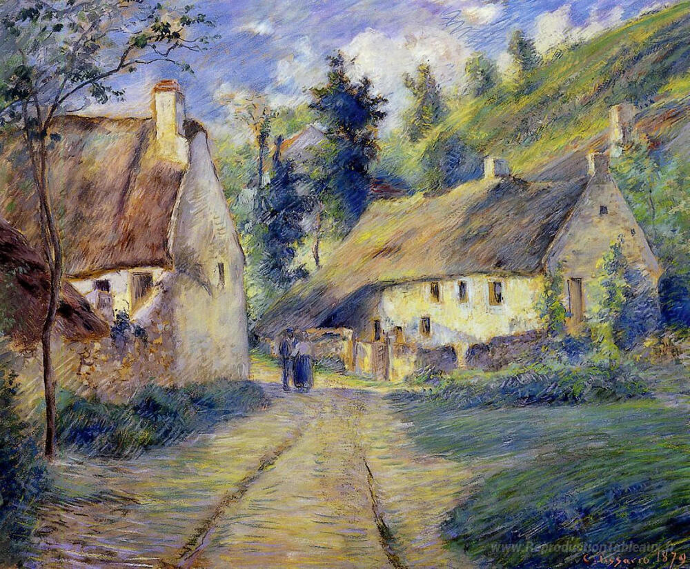 Nous vous proposons une reproduction artisanale sur toile du célèbre tableau 'Cotages à Auvers, près de Pontoise' de Camille Pissarro, provenant du Musée de la Reproduction.