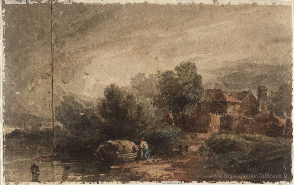 Nous vous proposons une reproduction artisanale sur toile du célèbre tableau 'Cottage par une rivière' de David Cox, provenant du Musée de la Reproduction.