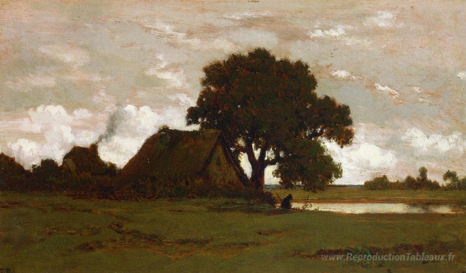 Nous vous proposons une reproduction artisanale sur toile du célèbre tableau 'Cottages près de l'étang' de Theodore Rousseau, provenant du Musée de la Reproduction.