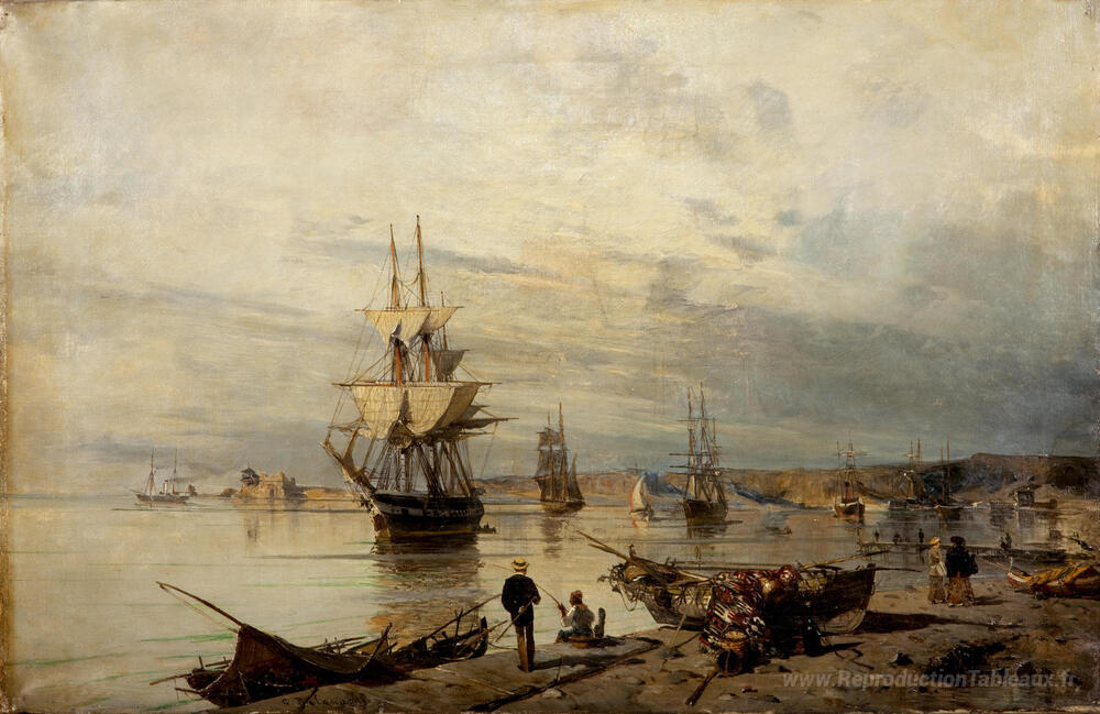 Nous vous proposons une reproduction artisanale sur toile du célèbre tableau 'Coucher de soleil au bord de la mer' de Konstantinos Volanakis, provenant du Musée de la Reproduction.
