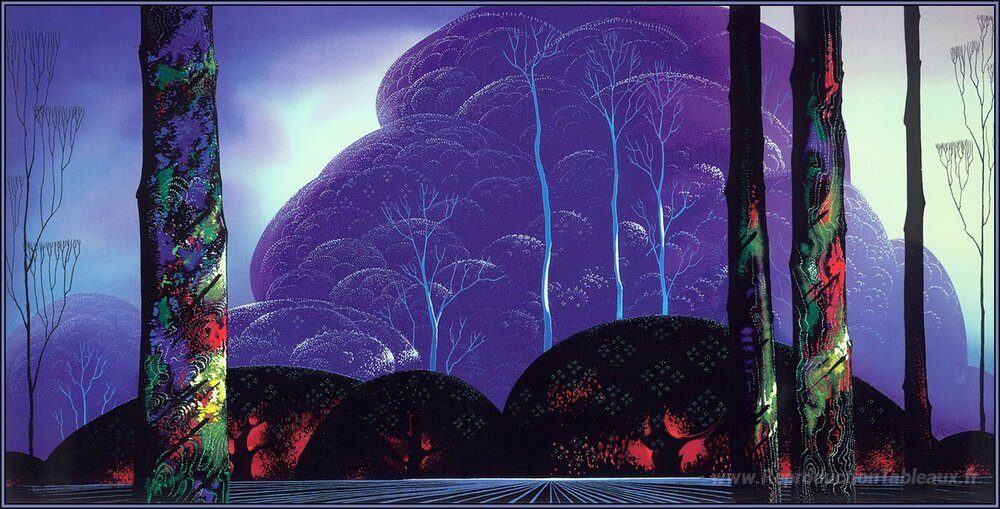 Nous vous proposons une reproduction artisanale sur toile du célèbre tableau 'Coucher de soleil violet' de Eyvind Earle, provenant du Musée de la Reproduction.