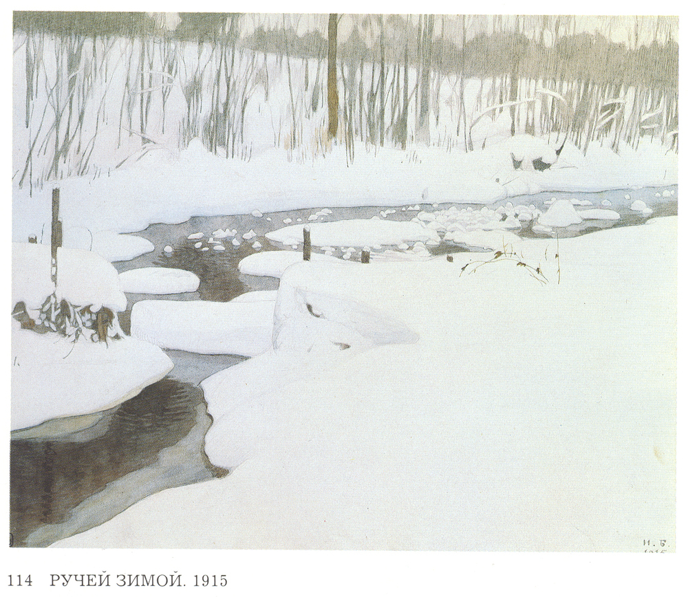 Nous vous proposons une reproduction artisanale sur toile du célèbre tableau 'Creek en hiver' de Ivan Bilibin, provenant du Musée de la Reproduction.