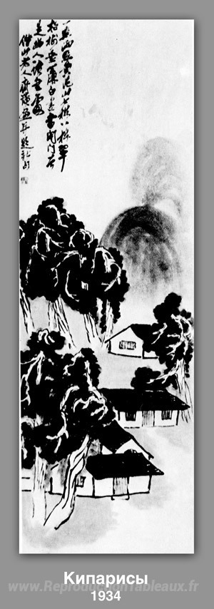 Nous vous proposons une reproduction artisanale sur toile du célèbre tableau 'Cyprès' de Qi Baishi, provenant du Musée de la Reproduction.