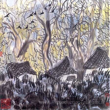 Nous vous proposons une reproduction artisanale sur toile du célèbre tableau 'Dans les bois' de Li Huasheng, provenant du Musée de la Reproduction.