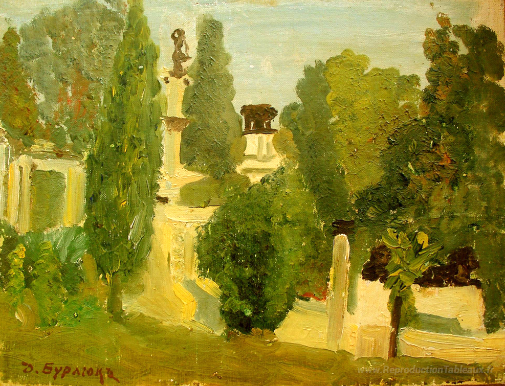 Nous vous proposons une reproduction artisanale sur toile du célèbre tableau 'Dans un parc' de David Burliuk, provenant du Musée de la Reproduction.
