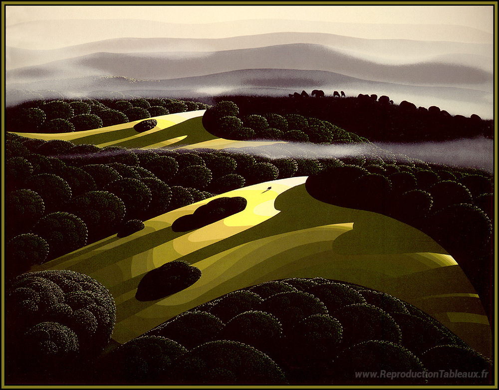 Nous vous proposons une reproduction artisanale sur toile du célèbre tableau 'Des collines et des vallées' de Eyvind Earle, provenant du Musée de la Reproduction.