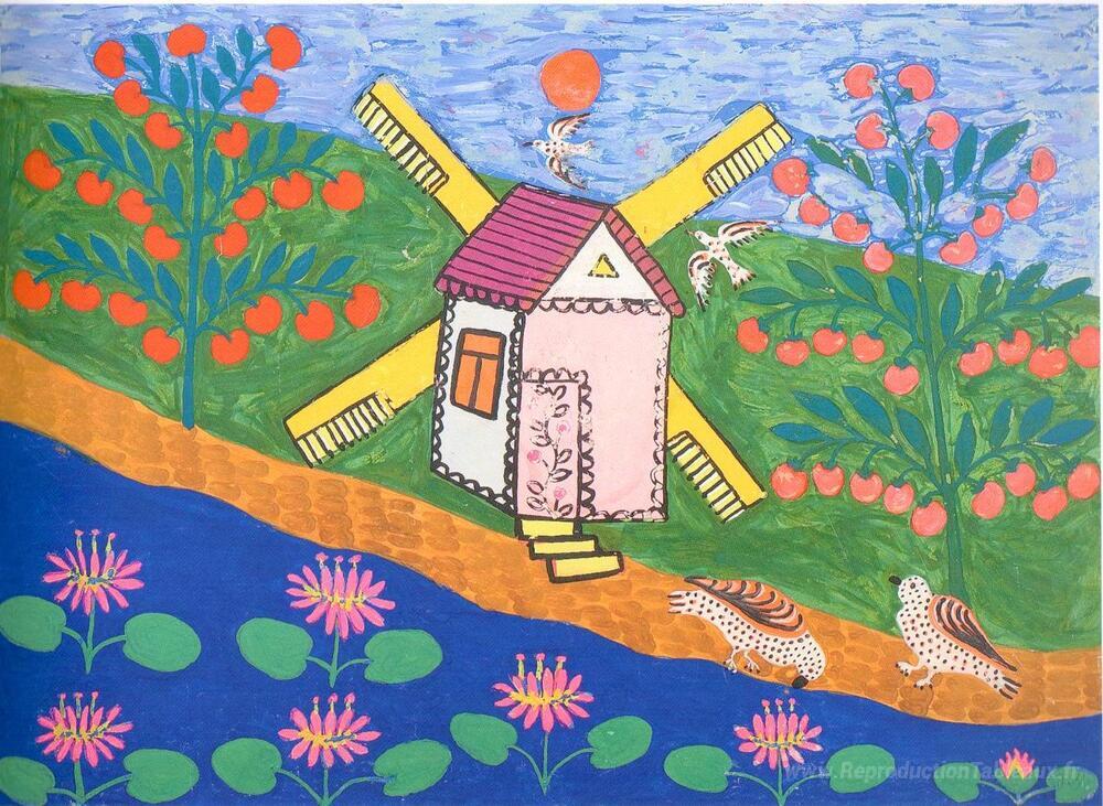 Nous vous proposons une reproduction artisanale sur toile du célèbre tableau 'Deux pigeons ont bu de l'eau par un moulin à vent et une Ford' de Maria Primachenko, provenant du Musée de la Reproduction.