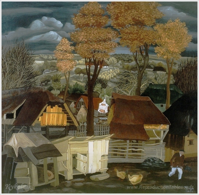 Nous vous proposons une reproduction artisanale sur toile du célèbre tableau 'Djuras cortile' de Ivan Generalic, provenant du Musée de la Reproduction.