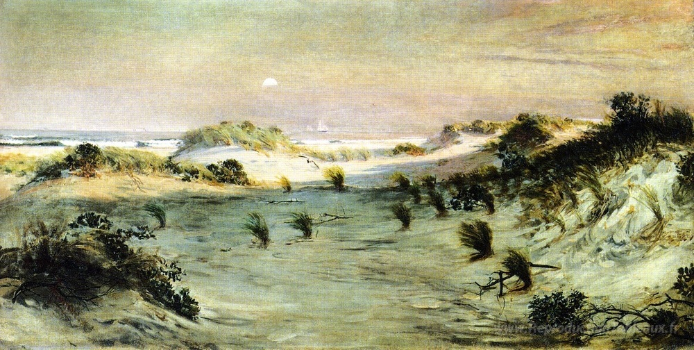 Nous vous proposons une reproduction artisanale sur toile du célèbre tableau 'Dunes de sable au coucher du soleil, Atlantic City' de Henry Ossawa Tanner, provenant du Musée de la Reproduction.