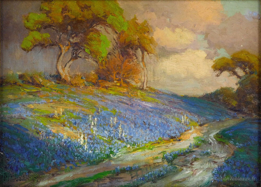 Nous vous proposons une reproduction artisanale sur toile du célèbre tableau 'En fin d'après-midi dans les Bluebonnets, S. W. Texas' de Robert Julian Onderdonk, provenant du Musée de la Reproduction.