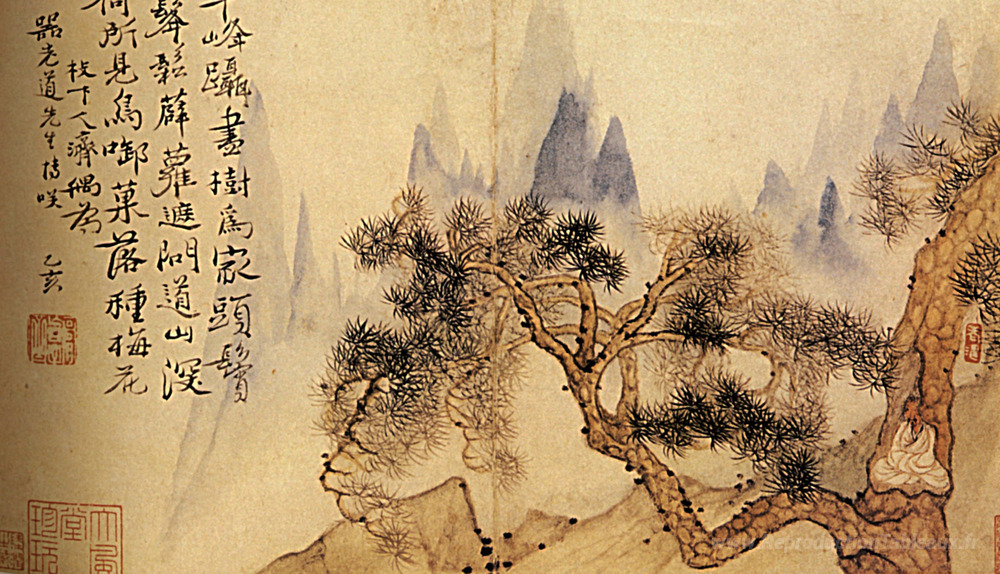 Nous vous proposons une reproduction artisanale sur toile du célèbre tableau 'En méditation, au pied des montagnes impossible' de Shitao, provenant du Musée de la Reproduction.