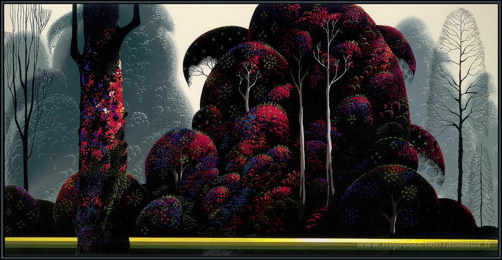Nous vous proposons une reproduction artisanale sur toile du célèbre tableau 'Eucalyptus cramoisi' de Eyvind Earle, provenant du Musée de la Reproduction.