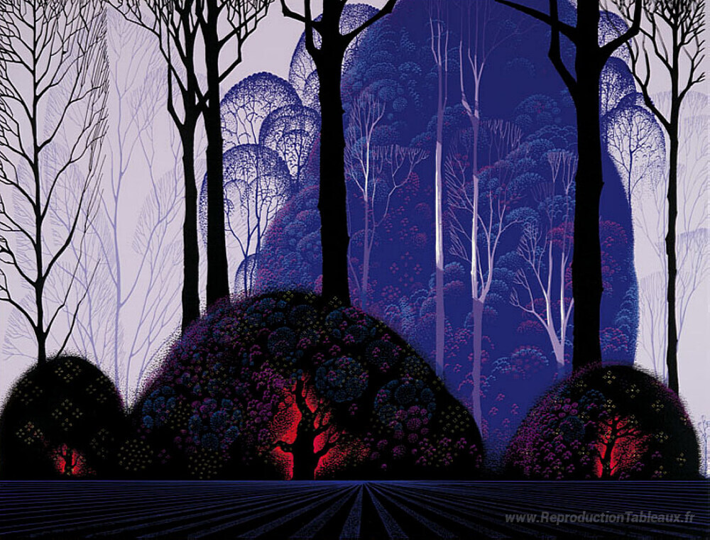 Nous vous proposons une reproduction artisanale sur toile du célèbre tableau 'Eucalyptus violet' de Eyvind Earle, provenant du Musée de la Reproduction.