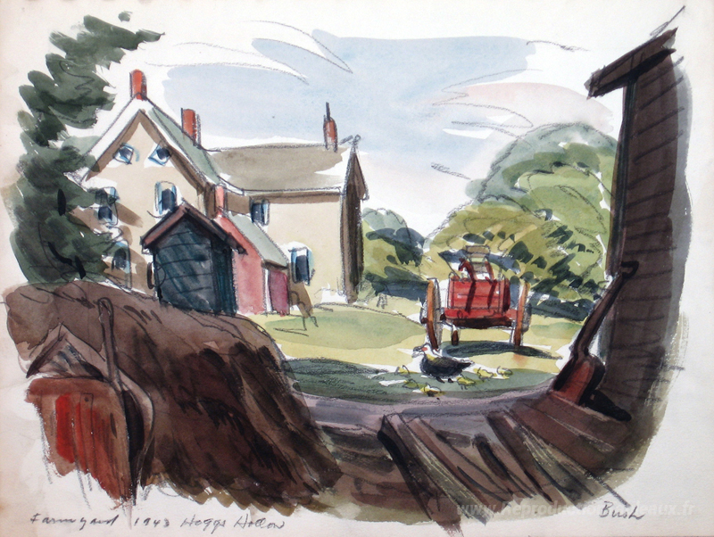 Nous vous proposons une reproduction artisanale sur toile du célèbre tableau 'Farmyard, Hogg’s Hollow, Toronto' de Jack Bush, provenant du Musée de la Reproduction.