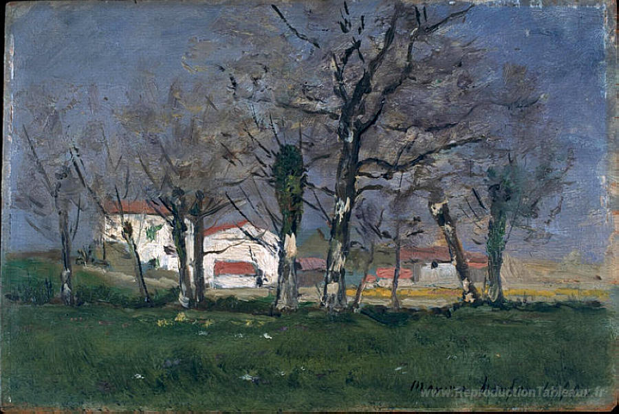Nous vous proposons une reproduction artisanale sur toile du célèbre tableau 'Ferme dans les arbres' de Maxime Maufra, provenant du Musée de la Reproduction.