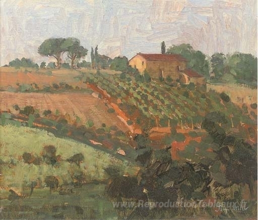 Nous vous proposons une reproduction artisanale sur toile du célèbre tableau 'Ferme en Toscane' de John Miller, provenant du Musée de la Reproduction.