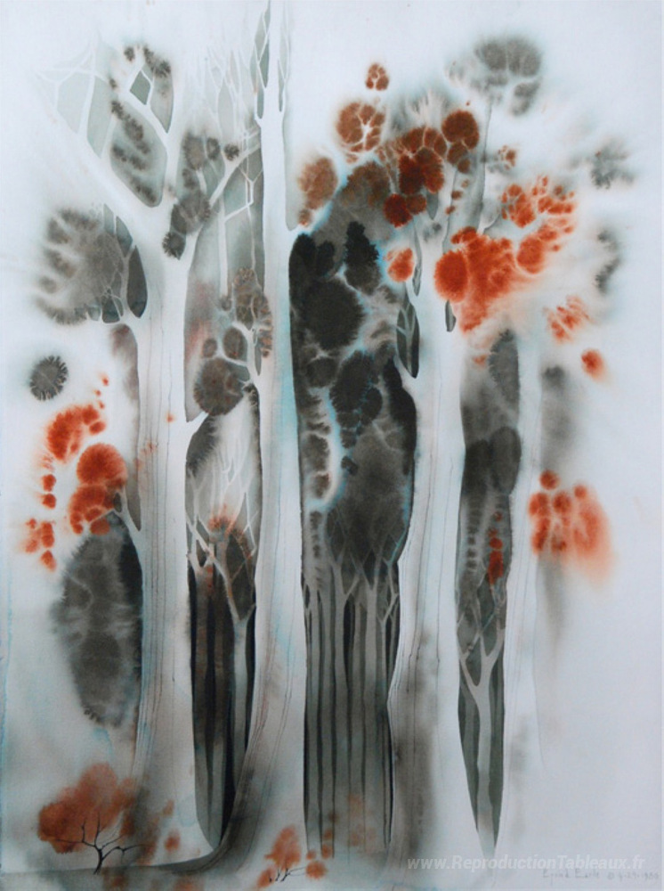 Nous vous proposons une reproduction artisanale sur toile du célèbre tableau 'Forêt d'automne' de Eyvind Earle, provenant du Musée de la Reproduction.