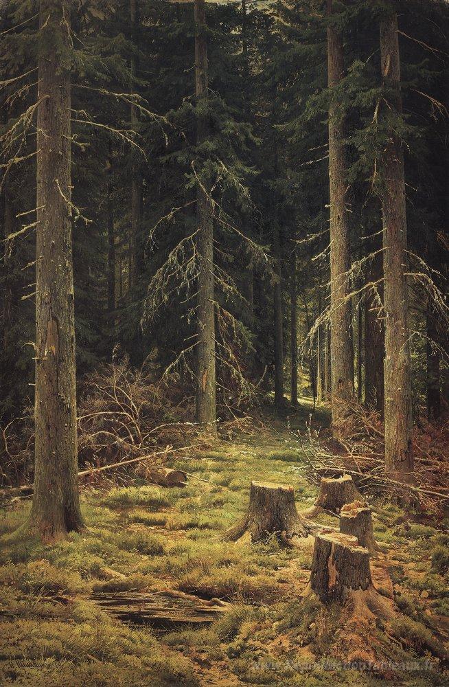 Nous vous proposons une reproduction artisanale sur toile du célèbre tableau 'Forêt de conifères' de Ivan Shishkin, provenant du Musée de la Reproduction.