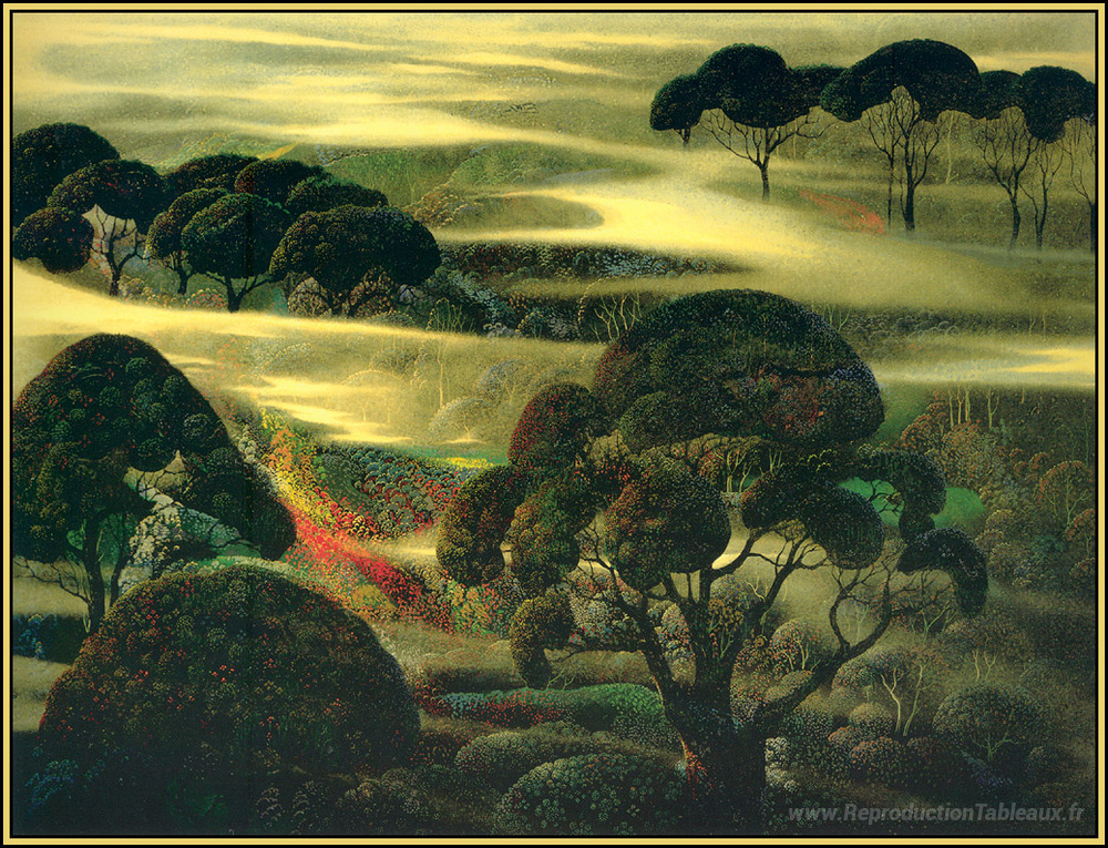 Nous vous proposons une reproduction artisanale sur toile du célèbre tableau 'Forêt en brouillard' de Eyvind Earle, provenant du Musée de la Reproduction.