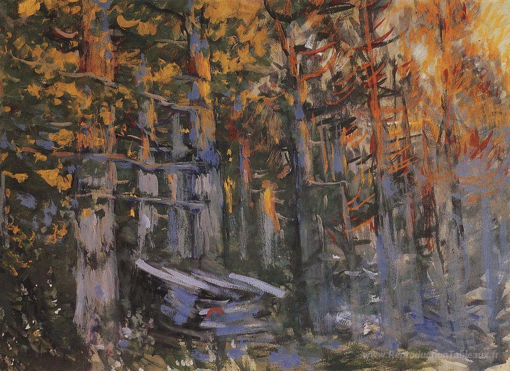 Nous vous proposons une reproduction artisanale sur toile du célèbre tableau 'Forêt' de Konstantin Korovin, provenant du Musée de la Reproduction.